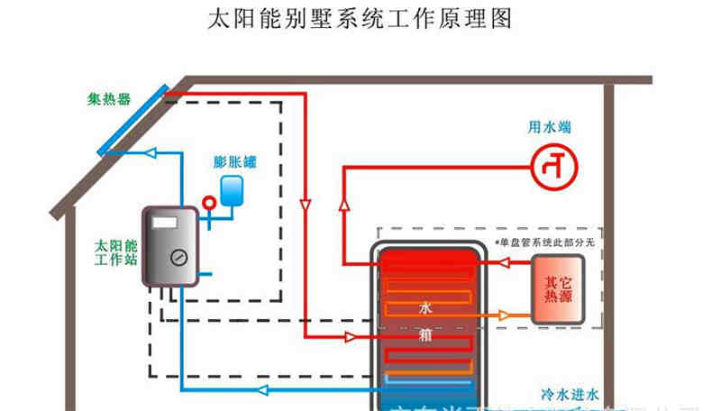 4.采用平板太陽能集熱器,雙回路系統,不怕凍,四季使用。