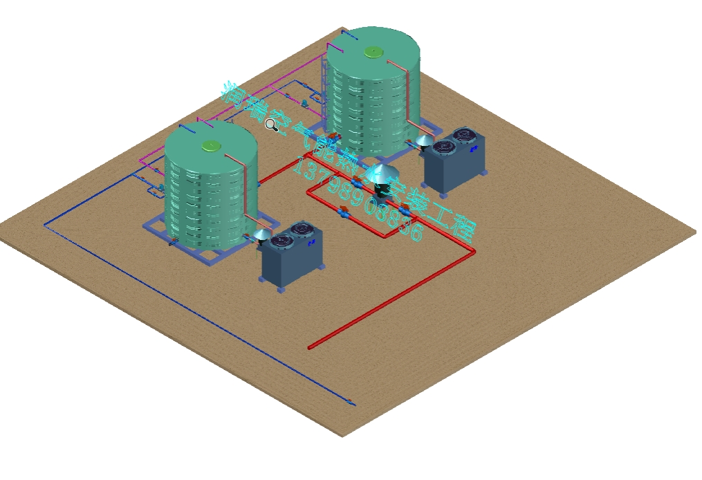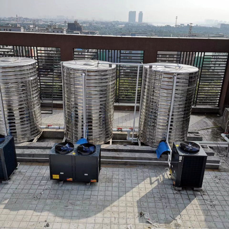 空氣能熱泵和兩個10m³的立式不銹鋼保溫水箱,(水箱有效容量為18m³)就可以完全滿足酒店的熱水需求。不銹鋼水箱帶底座和爬梯。
