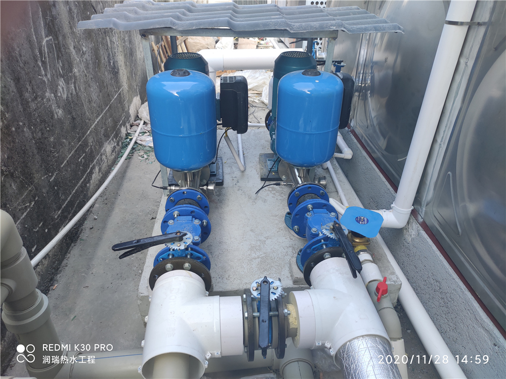 兩臺7.5KW的自動變頻增壓泵24小時供應熱水