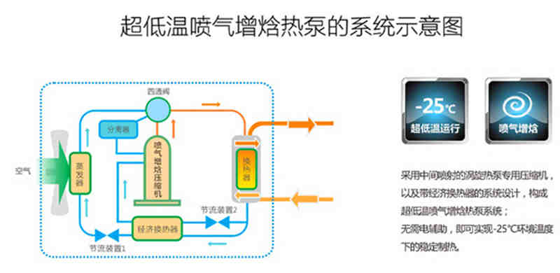 第二代噴氣增焓和多級壓縮技術的聯合應用,大大提高制熱效率。
