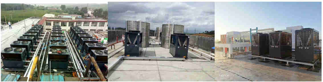3、在學生宿舍樓頂安裝6臺赫派KFXRS-100H常溫循環式空氣能熱水器,和450塊太陽能集熱板,6個15噸的保溫水箱,