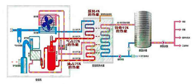螺桿空壓機在運行中把電能轉換為機械能,機械能又轉換為熱能,在機械能轉換為熱能過程中,空氣得到強烈的高壓壓縮,溫度驟升,這是機械能量轉換現象,機械螺桿的高速旋轉,同時也摩擦發熱,這些產生的高熱由空壓機潤滑油的加入混合成油/氣蒸汽排出機體,這部分高溫油/氣流的熱量相當于空壓機輸入功率的1/4,產生的溫度通常常在80℃(冬季)-100℃(夏秋季),這些熱能都由于機器運行溫度的需求,被無端地廢氣排往大氣中,即空壓機的散熱系統來完成機器運行的溫度要求。空壓機余熱回收可使水、油冷熱交換,達到機油降溫,冷水升溫,從而產出生活、生產所需熱水。