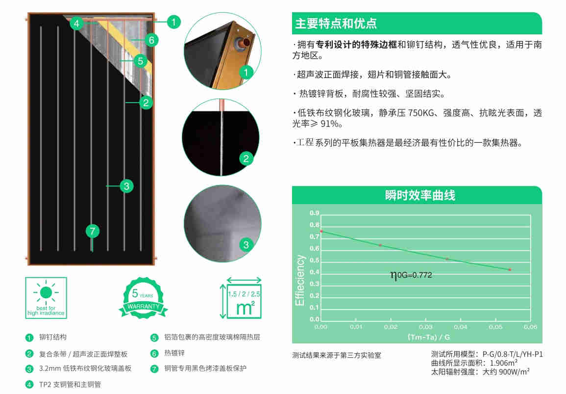 集熱器板芯流道材質為全紫銅,管帶式結構,超聲波焊接,吸熱體涂層為太陽光譜選擇性吸收涂層,吸收比0.86依0.02,發射比0.14依0.02,集熱器隔熱體為厚30mm玻纖棉,蓋板采用低鐵布紋鋼化玻璃。平板太陽能熱水器是小高層住宅配套設計開發的。水箱放置在陽臺,屋頂,墻壁等地方。平板太陽能集熱器放置在建筑欄里面陽臺,窗戶,屋頂,墻壁上,彌補了傳統的太陽能熱水器由于先天不足無法實現與建筑及環境完美結合的遺憾。集熱器與水箱互相分離,集熱器可靈活安裝在屋頂、天窗、陽臺或墻壁上,不受位置限制,達到了與高層建筑及環境一體化的完美結合。
