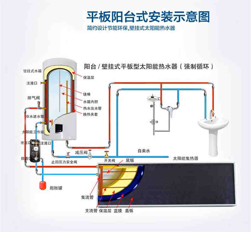 將儲熱水箱置于集熱器上方(最佳垂直距離為0.3~1米),循環介質在集熱器中接受太陽幅射的加熱,溫度上升,造成集熱器及儲熱水箱換熱裝置中熱媒溫度不同而產生密度差,因此引起浮力,此熱虹吸現象促使熱媒在貯熱水箱及集熱器中上下自然流動,熱媒通過換熱裝置向貯熱水箱中的水進行熱交換,加熱水箱中的水。當貯熱水箱水溫達不到設定溫度時,輔助能源啟動進行輔助加熱,保證24小時熱水供應。