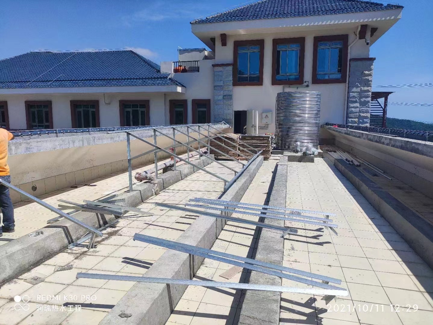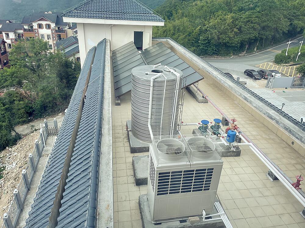 深圳市鹽田區大梅沙東部華僑城大峽谷東大門往上1.5公里處(大峽谷員工宿舍旁)設有一棟宿舍樓,每天需要5噸生活熱水,該項目采用空氣能熱泵輔助平板太陽能為熱源供應生活熱水。