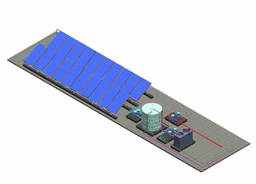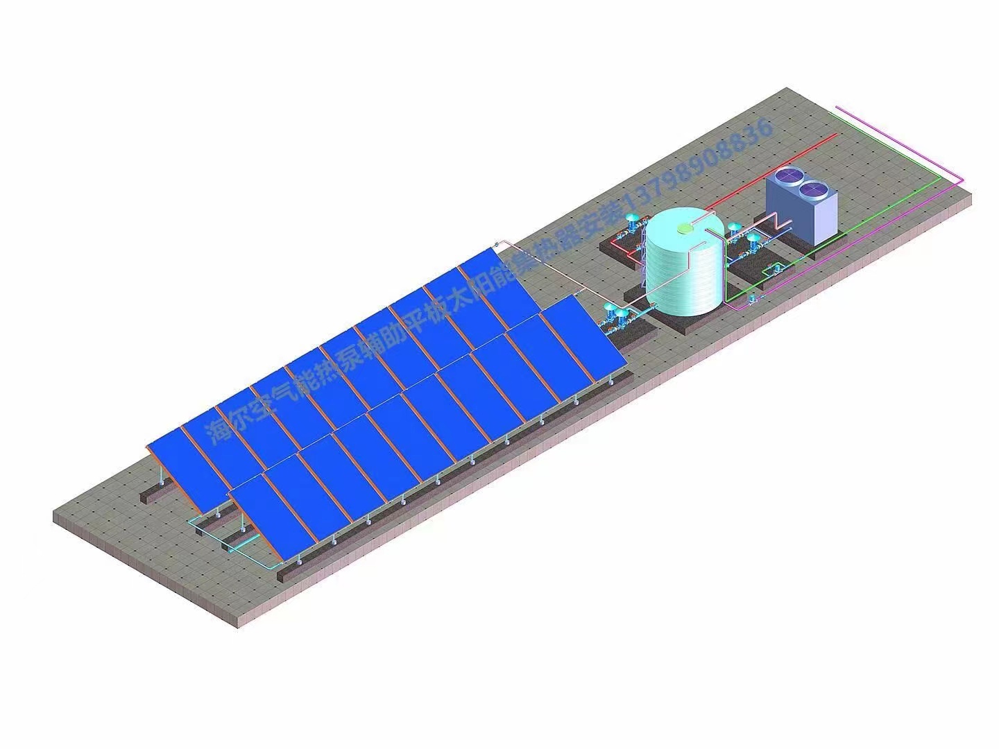 在方案設計過程中,最重要的參考值是建筑物的屋頂面積,直接決定了太陽能的設計容量。針對需要生活熱水的項目,太陽能設計應優先滿足熱水需求,其 次在最大化利用免費的太陽能的原則下,充分利用可設置太陽能集熱器的屋頂面 積設計本方案。本項目設計40平方米平板太陽能,配一臺十匹空氣能熱泵即可滿足熱值的需求