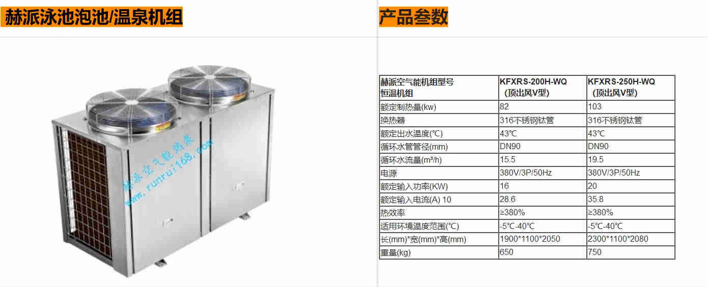 赫派空氣能溫泉熱泵機(jī)組是專門(mén)針對(duì)各種溫泉池、SPA池、桑拿池等設(shè)計(jì)的機(jī)組,使用水的溫度一般高于泳池水溫,所以出水溫度不超過(guò)45℃(特殊要求可以設(shè)定加熱到80度)。此系列機(jī)組的冷凝器使用鈦管和PPR材料制作,能有效地抵抗氯離子的腐蝕和減少溫泉水的水垢形成。