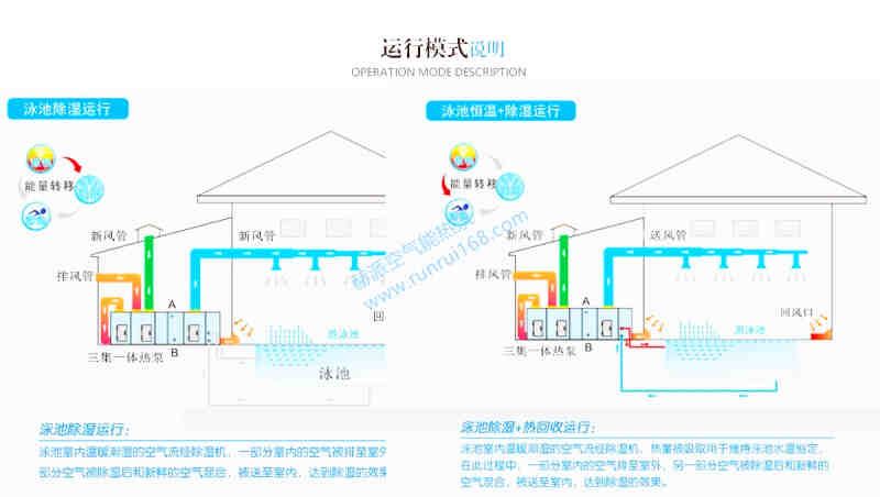 泳池除濕熱泵是專門針對泳池區高濕環境而研發的專用空氣處理設備,集制冷、除濕、通風、再熱、池水加熱于一體的多功能專用空調設備,是為泳池場所量身定制的專用空氣能熱泵產品。